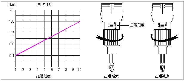 注意:机身上的扭矩调节刻度与电动螺丝刀输出扭矩的相互关系如扭矩标示图所示,要想输出精确的扭矩,请使用扭矩测试仪来配合调整输出扭矩。