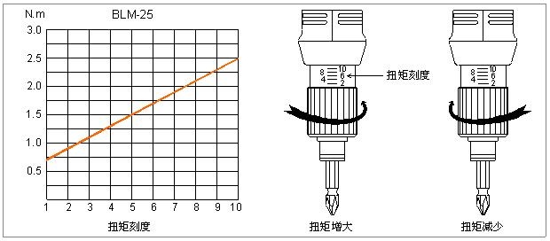 注意:机身上的扭矩调节刻度与电动螺丝刀输出扭矩的相互关系如扭矩标示图所示,要想输出精确的扭矩,请使用扭矩测试仪来配合调整输出扭矩。