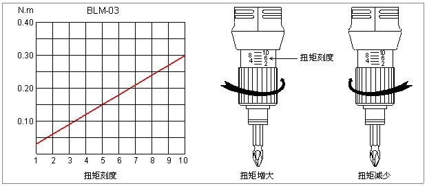 注意:机身上的扭矩调节刻度与电动螺丝刀输出扭矩的相互关系如扭矩标示图所示,要想输出精确的扭矩,请使用扭矩测试仪来配合调整输出扭矩。